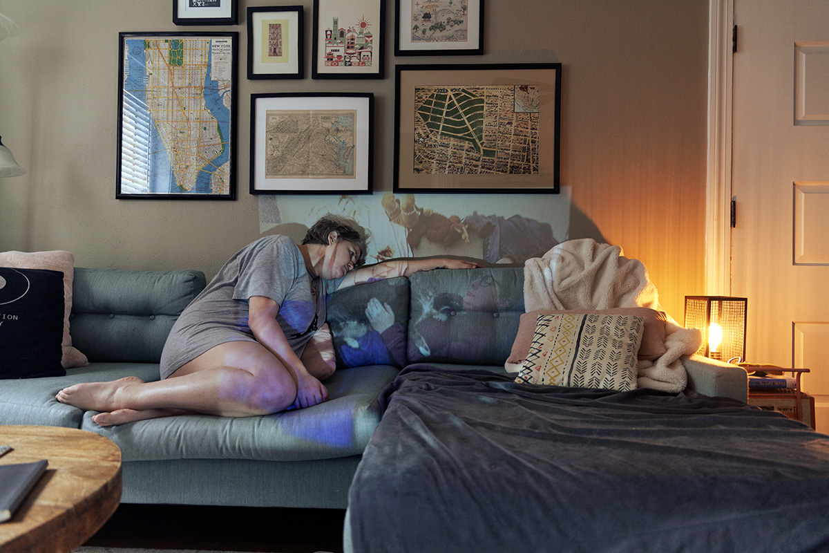 As a conceptual photographer, I use projection to create layered visual narratives that explore how the past lingers in the present. In this piece, her image merges with the fabric of the couch, the light in the room, and my own body, allowing her presence to be seen and felt in a space that is both real and remembered. It is a meditation on what remains.